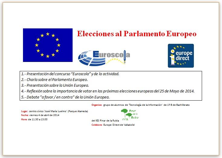 Durante los próximos días trabajaremos en la preparación del debate del día 4 de abril en el Centro Cívico José María Luelmo, en el que hablaremos de intereses europeos, pero siempre relacionados con las próximas elecciones del Parlamento. En la primera parte del evento, nuestro representante del grupo expondrá un informe sobre los conocimientos de la Unión Europea. En la segunda parte, unos miembros de Europa Direct nos darán una charla acerca del funcionamiento del Parlaento. Y para terminar dividiremos la clase en dos grupos (uno a favor de la UE, y otro en contra) para debatir los asuntos de la actualidad europea y sus conflictos.